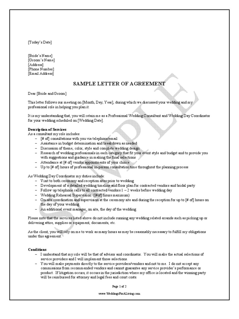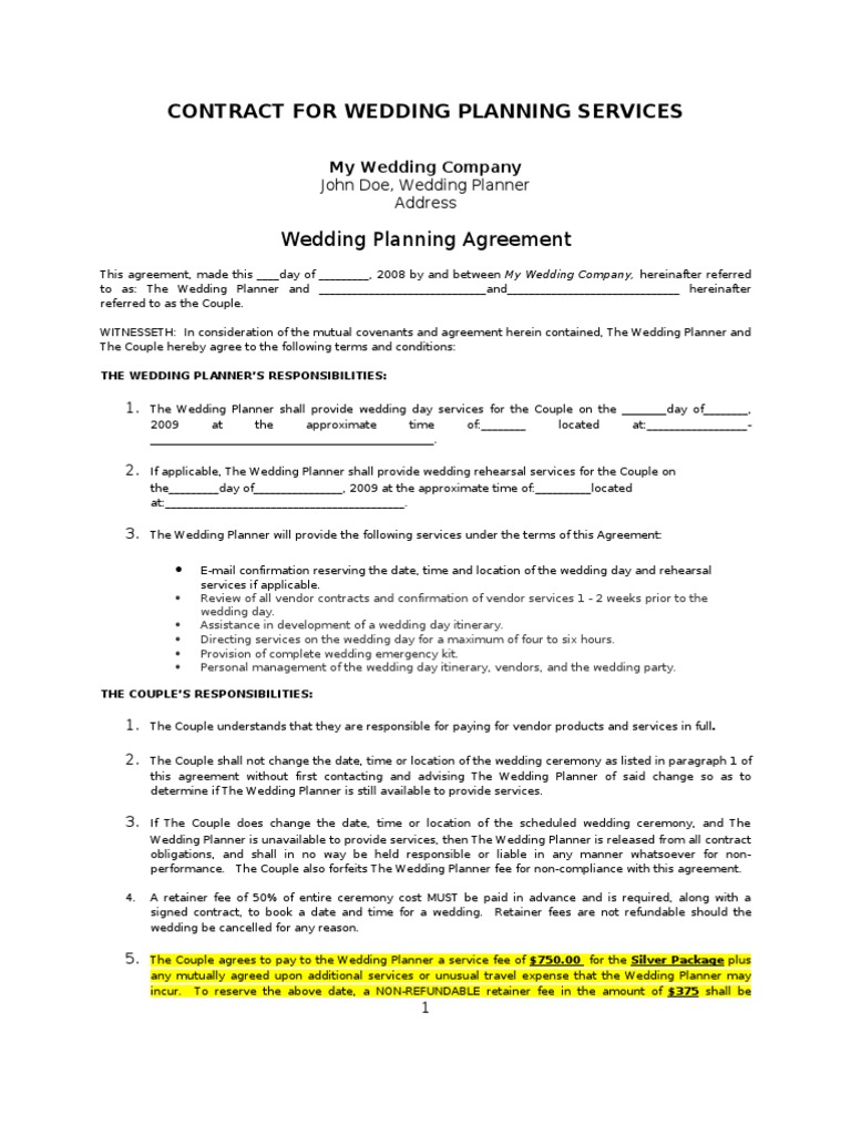 The wedding planner will provide unlimited correspondence via email and phone for any questions or concerns the couple has concerning the coordinating and planning processes. No contract no client. Full wedding planning contract 172 collingwood rd sutton sm1 2rb 0845 463 3604 rachelatthanda creationscouk wwwthanda creationscouk thanda creations ltd registered office. You are either fortunate or blessed enough to find your significant half who is willing to spend the rest of hisher life with you or you are simply asexual and have decided to live out the rest of your life as a priest or as a nun or perhaps someone.